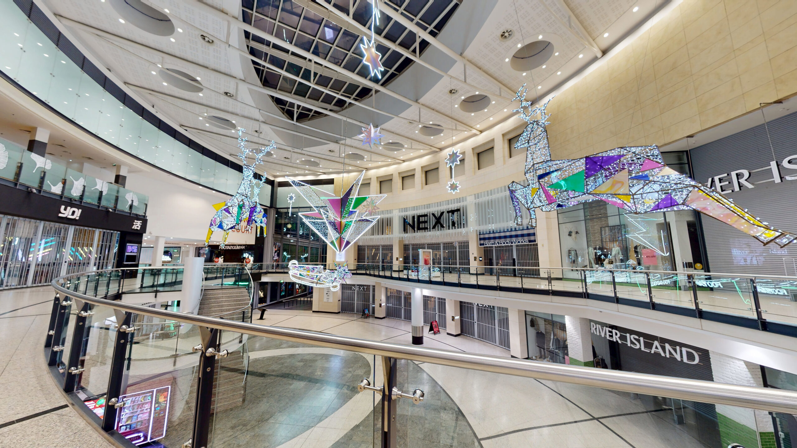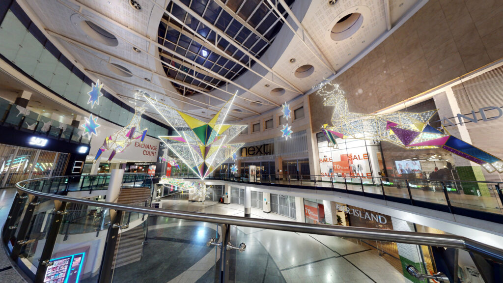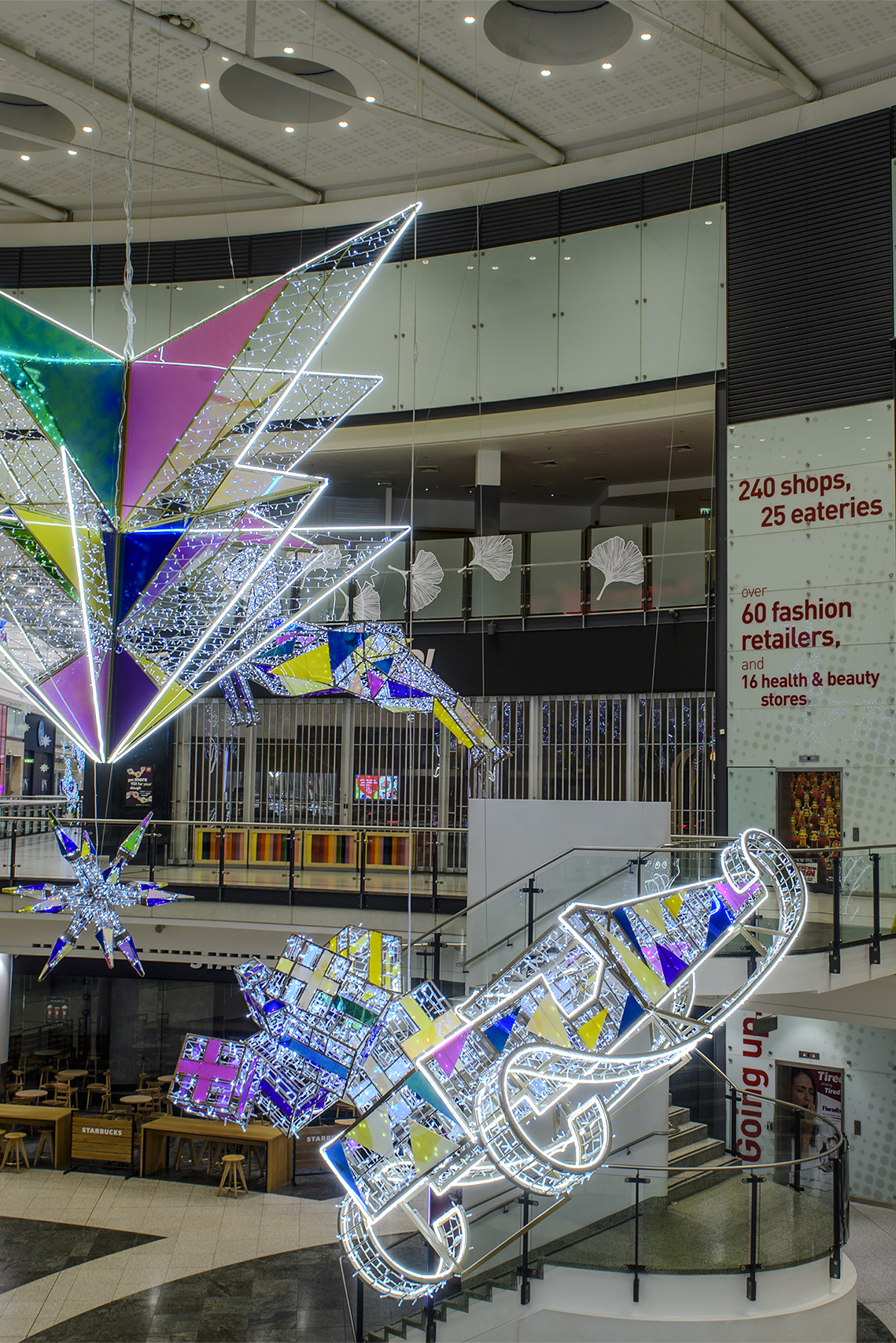 Given the scale and complexity of Manchester Arndale, every element was first built as a detailed 3D model, allowing us to superimpose pieces into the mall and plan precise placement across each zone. This included geometric tree clusters, star bursts, and flying reindeer ranging from 2m to 5m tall as they progress toward the suspended sleigh. The result is a cohesive, high-impact visual journey that feels energetic, futuristic, and entirely unique to the Arndale environment.