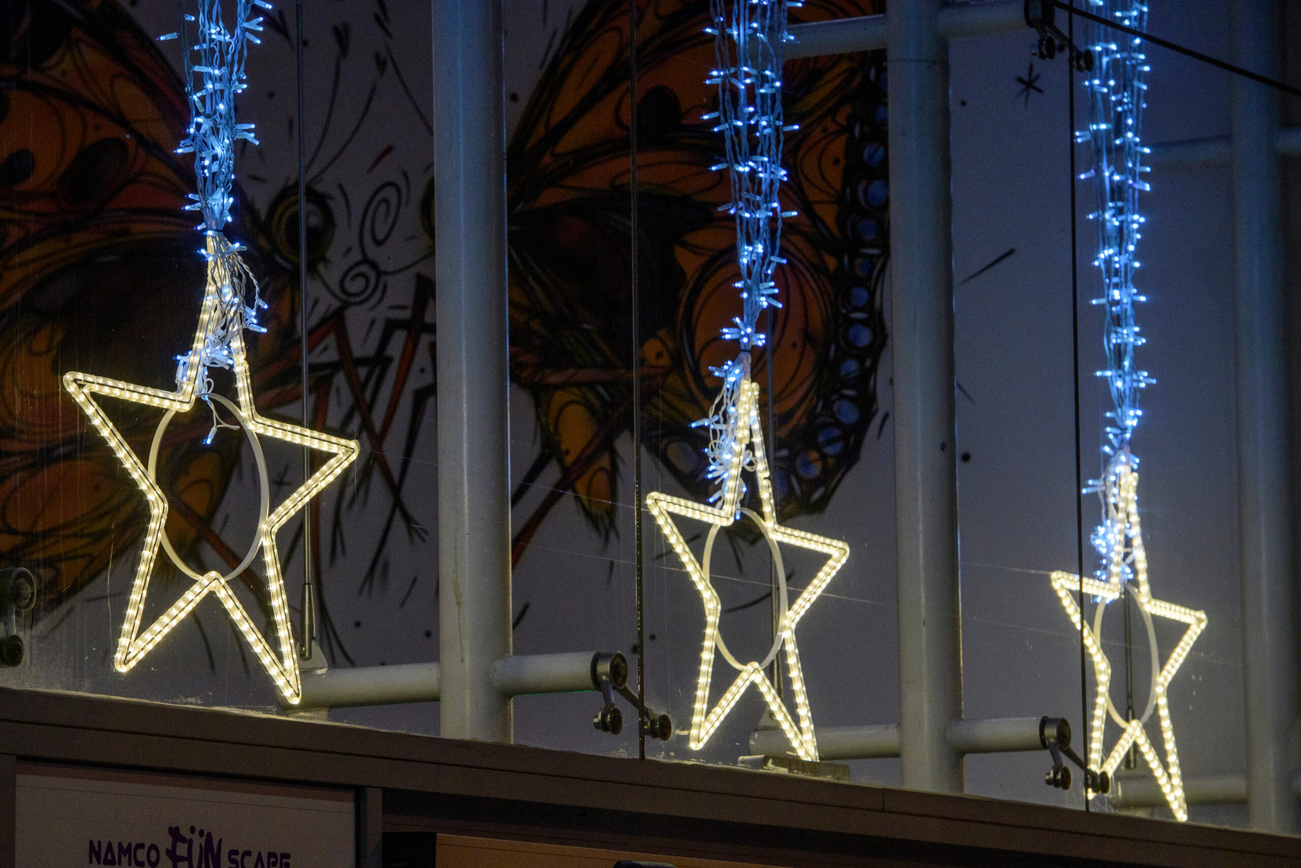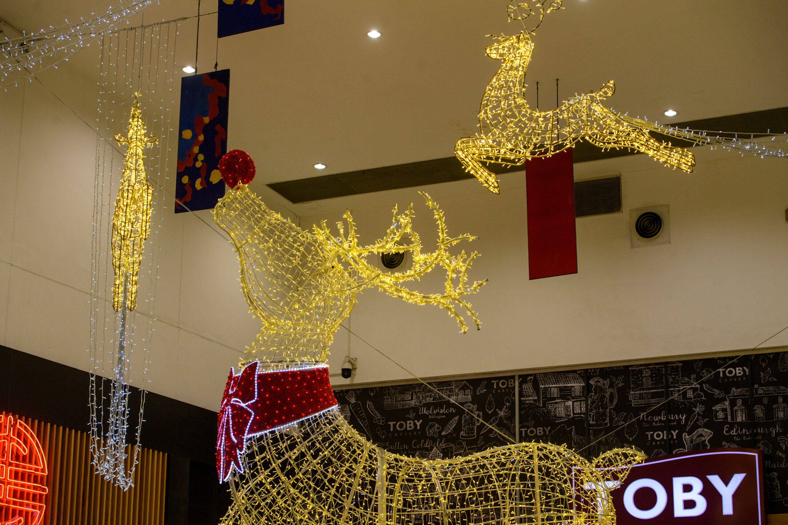 To support this goal, we incorporated a balanced mix of RGB, cool white, and warm white lighting, allowing the scheme to shift in tone between vibrant colour and traditional warmth. The installation included several standout hero pieces, such as a 7.5m Reindeer, 7m RGB animated colour-changing tree, 5m gold walk-through present box, and a 6m-wide set of RGB angel wings. These were enhanced by a holographic star theme carried across the site, adding depth and contemporary sparkle. Our team also carefully coordinated installation around the centre’s late-night restaurant trade to minimise disruption.